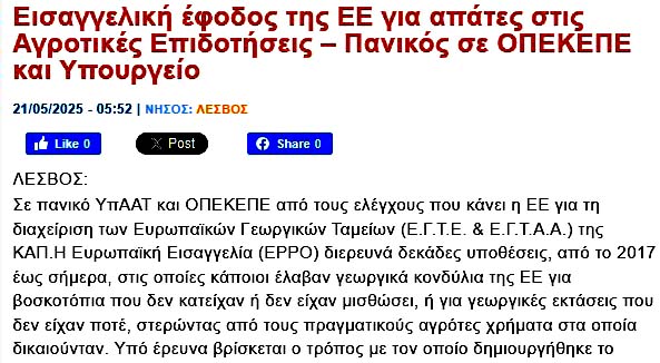 20-5-2025 - Βιομηχανία κατοχύρωσης ψεύτικων δικαιωμάτων και κλοπή κοινοτικών ενισχύσεων σε βάρος των πραγματικών αγροτών, δείχνουν όλα τα στοιχεία που έχουν στα χέρια τους οι εισαγγελικές αρχές και τα οποία αποτέλεσαν την αφορμή για εκτεταμένη έρευνα από το πρωί της Δευτέρας 19 Μαίου στα γραφεία και στις βάσεις δεδομένων του ΟΠΕΚΕΠΕ.