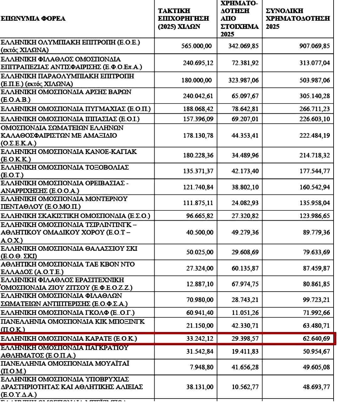 Οι μετρήσεις του e-kouros, όμως, και οι συγκρίσεις μεταξύ των αθλητικών ομοσπονδιών δίνουν και την επόμενη δυνητική κατανομή των επιχορηγήσεων από τη ΓΓΑ προς τις ομοσπονδίες για το 2025, όπου φαίνεται και η μειονεκτική θέση της ΕΛΟΚ (για να μην πούμε ..."πάτος"!) σε σχέση με τις άλλες ομοσπονδίες!