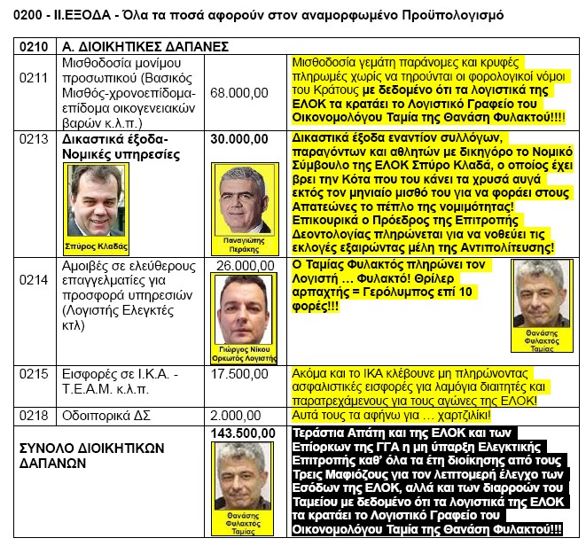 2 - Αποκρύπτουν ή παρουσιάζουν παντελώς ελλιπή οικονομικά στοιχεία σε προϋπολογισμούς, απολογισμούς και ισολογισμούς στα Πρακτικά του ΔΣ, των ΓΣ και στη ΔΙΑΥΓΕΙΑ, 3 - Διαλύουν ή/και δεν εκλέγουν εσκεμμένα (πρόσφατες εκλογές) την εκ του νόμου ισχυρή Ελεγκτική Επιτροπή για να αποφύγουν τους διαχειριστικούς οικονομικούς ελέγχους, 4 - "Μπαζώνουν" τις οικονομικές απάτες στην ΕΛΟΚ δια συγκεκριμένου μαϊμού-Ορκωτού Λογιστή, "Και τα Λεφτά στην Κάλτσα"! 5 - Παίρνουν στο Σπίτι τους το Ταμείο και τα Λογιστικά της ΕΛΟΚ,