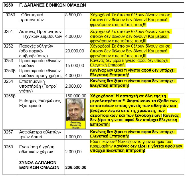 Κωδικοί 0250 έως ο254: Εδώ πλέον αρχίζει το αλισβερίσι με τους προπονητές, οι οποίοι είναι και οι ιδιοκτήτες των συλλόγων κατά γενική και σιωπηρή αποδοχή από ένα Κράτος ακραία ανίκανο να συντηρήσει τον ερασιτεχνικό αθλητισμό! Οδοιπορικά προπονητών 8.500 € φυσικά τα δίνουν σε εκείνους, που βάζουν τους αντιπροσώπους των συλλόγων τους να ψηφίζουν χωρίς καμιά διαμαρτυρία τις αποφάσεις της Διοίκησης. Δαπάνες προπονητών-τεχνικών 4.000 € το ίδιο. Παροχές αθλητών 20.000 € για τους αθλητές των συλλόγων, που τους ψηφίζουν. Προετοιμασία Εθνικών Ομάδων 15.000 €! Σε αυτές βάζουν όποιους αθλητές αυτοί θέλουν!