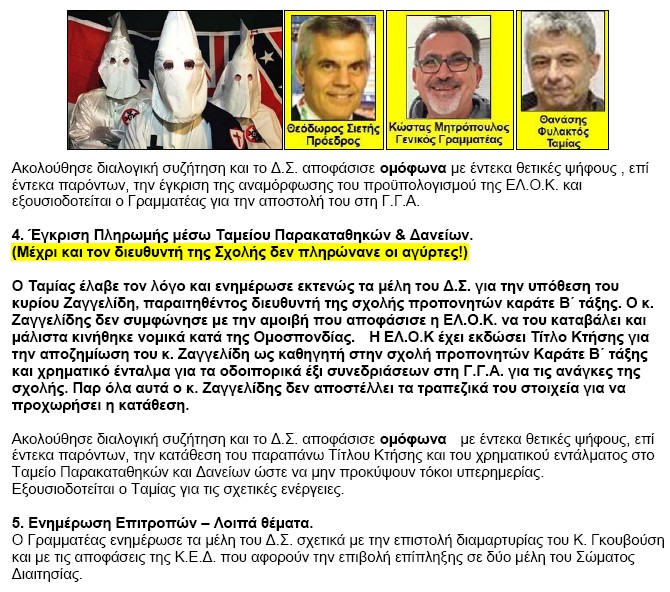 Στο κλείσιμο αυτού του Πρακτικού του ΔΣ της ΕΛΟΚ παρατηρούμε την εκδικητικότητα του ΔΣ/ΕΛΟΚ κατά τού (κρατηθείτε !!!) ... Διευθυντή της τελευταίας Σχολής Προπονητών Καράτε καθηγητή Πανεπιστημίου κ. Γιώργου Ζαγγελίδη λόγω προφανώς μη υποταγής του στις επιθυμίες των Τριών Μαφιόζων! Και με ποιο τρόπο τον εκδικήθηκαν? Δεν του πλήρωναν τα ... οδοιπορικά για να επιβλέπει τη Σχολή Προπονητών και τις διδακτικές ώρες που απασχολήθηκε σε αυτήν!!!