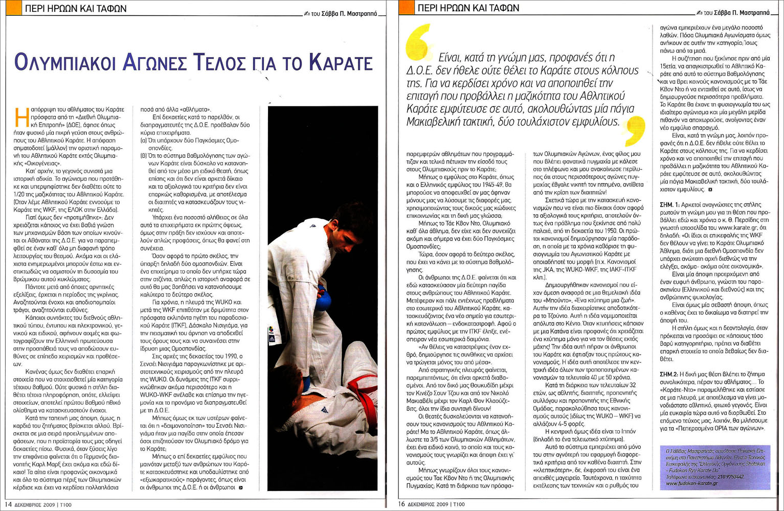 Στο τεύχος 100/Δεκεμβρίου 2009 του περιοδικού, υποτίθεται του χώρου, "Μονοπάτι για τις Πολεμικές Τέχνες" (αριστερά), και στις σελίδες 14-16, ο Σάββας Μαστραπάς, ένας από τους ειδικότερους τεχνικούς και αρθρογράφους στο χώρο του καράτε, καταθέτει τις απόψεις του σχετικά με τις παγκόσμιες εξελίξεις του καράτε ως προς την Ολυμπιακή προοπτική του, οι οποίες απόψεις κάθε άλλο παρά την πραγματικότητα απεικονίζουν. Χαρακτηρίζω το παραπάνω περιοδικό ως "υποτίθεται του χώρου", διότι κατά την πάγια τακτική περίεργης αντίληψης του εκδότη του ΚΑΝΕΝΑ απολύτως ενδιαφέρον δεν παρουσιάζει για τον πολυπληθή κόσμο του Καράτε με τα ελάχιστα, ασυνεχή, αποσπασματικά και ασήμαντα άρθρα του περί το καράτε και τις δραστηριότητές του στην χώρα μας. Απόδειξη για το τελευταίο αποτελούν και οι "μισόκαρδες" φωτογραφίες που διανθίζουν τα λιγοστά άρθρα περί το καράτε, τους συλλόγους του και τις ομοσπονδίες του, οι οποίες φωτογραφίες είναι τόσο μικρές ώστε δεν αναγνωρίζει κανείς ούτε ένα πρόσωπο, μην έχοντας έτσι λόγο ύπαρξης!