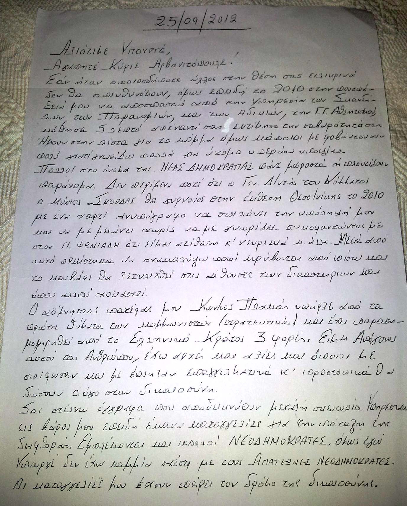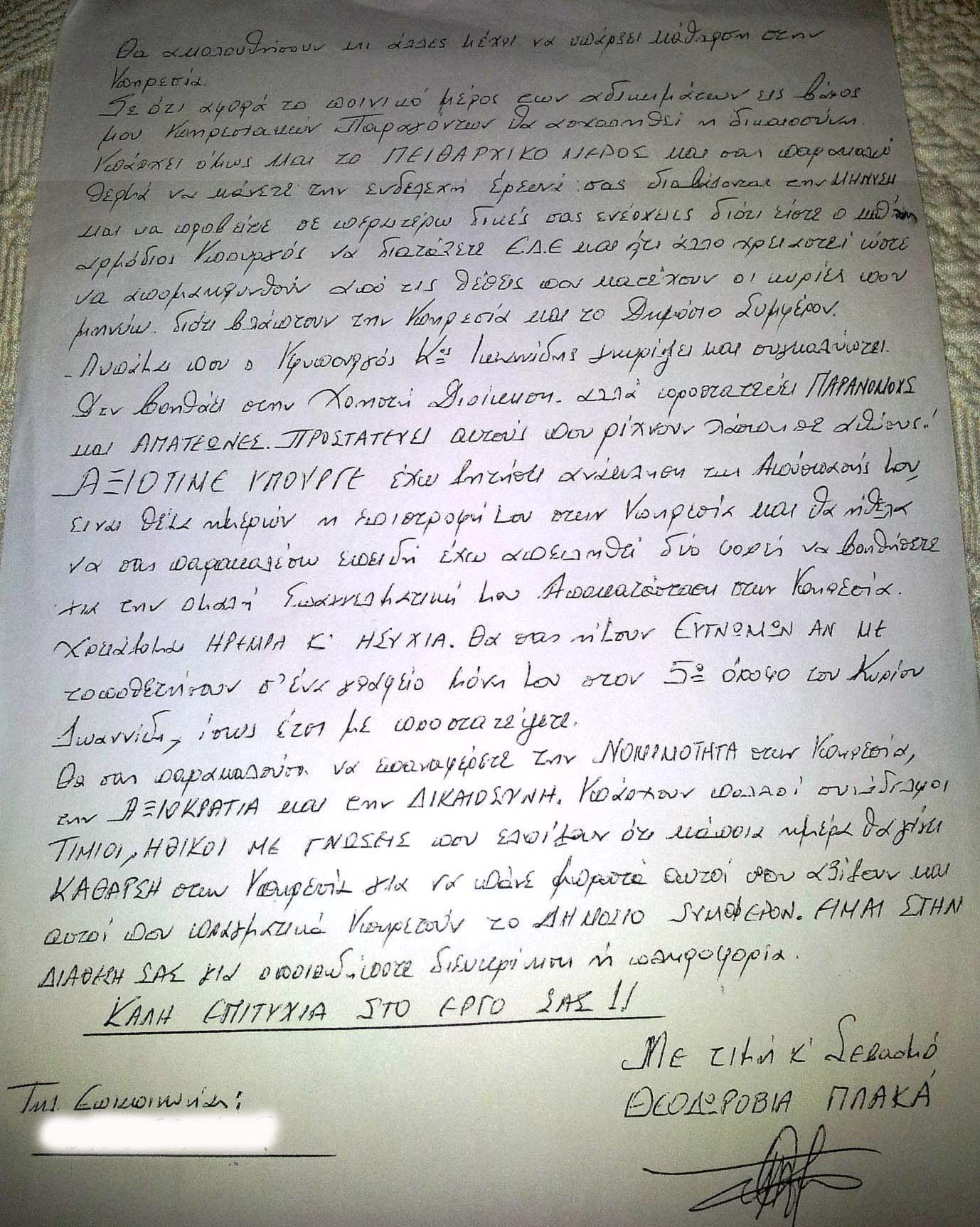 Και ιδιόχειρη επιστολή στον Αρβανιτόπουλο: