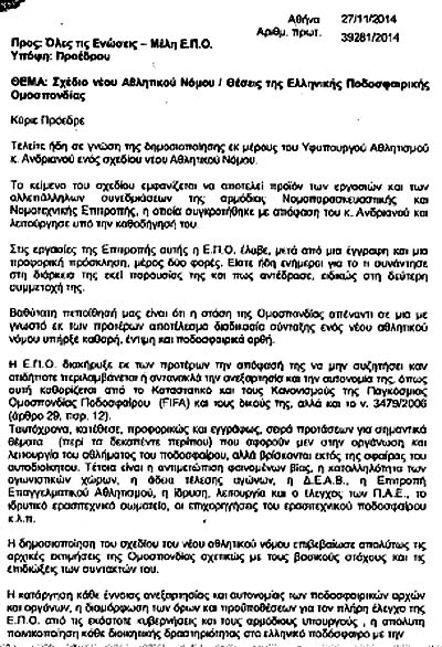 Στην συνέχεια αναφέρει τα εξής: «Η « δημοσιοποίηση του σχεδίου του νέου αθλητικού νόμου επιβεβαίωσε απολύτως τις αρχικές εκτιμήσεις της ομοσπονδίας σχετικώς με τους βασικούς στόχους και τις επιδιώξεις των συντακτών του. Η κατάργηση κάθε έννοιας ανεξαρτησίας και αυτονομίας των ποδοσφαιρικών αρχών και οργάνων, η διαμόρφωση των όρων και προϋποθέσεων για τον πλήρη έλεγχο της ΕΠΟ από τις εκάστοτε κυβερνήσεις και τους αρμόδιους υπουργούς, η απόλυτη ποινικοποίηση κάθε διοικητικής δραστηριότητας στο ελληνικό ποδόσφαιρο με την κατάργηση ακόμη και του τεκμηρίου αθωότητας, η πλήρης και απόλυτη καταστρατήγηση του Καταστατικού και των Κανονισμών και η διάλυση της θεσμοθετημένης πυραμιδικής οργάνωσης του αθλήματος (Σωματείο-Ενωση-Ομοσπονδία) με την κατάργηση των Ενώσεων (χάνουν πλέον την ιδιότητα του μέλους της ΕΠΟ αφού δεν μετέχουν στις γενικές συνελεύσεις) είναι μερικά από εκείνα τα στοιχεία που προκύπτουν, ως δήθεν προτάσεις, από το κείμενο του σχεδίου και αποτελούν την αποκλειστική επιδίωξη των εμπνευστών του.