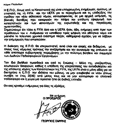 Καταλήγοντας στην επιστολή αναφέρεται ότι η ΕΠΟ ενημέρωσε αμέσως την FIFA και την UEFA, καταγράφοντας τις βασικές διατάξεις που καταργούν την πλήρη και απόλυτη εφαρμογή των καταστατικών και των κανονισμών της ευρωπαϊκής και της παγκόσμιας ομοσπονδίας.