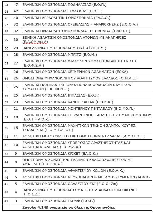 {Αν δούμε προσεκτικά τις ομοσπονδίες από το τέλος προς την αρχή, θα παρατηρήσουμε ότι οι ομοσπονδίες με α/α 39-40-41-42-43-47-48 δεν πληρούν το άρθρο του νόμου για τα υποχρεωτικά 20 μέλη τους.}