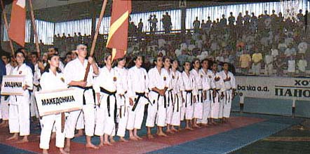 Παράταξη των ομάδων Ανδρών-Γυναικών στους Πανευρωπαϊκούς του Παραδοσιακού Καράτε, 26-6-2004, στα Σκόπια. Κάπου φαίνεται και η Ελληνική σημαία χάρη στους επίμονους πολίτες και σε πείσμα των ανίκανων πολιτικών, κύριε Γιώργο Ορφανέ, και εσείς δεν μας αναγνωρίζετε παράνομα για χάρη του φίλου σας του Γερόλυμπου υιοθετώντας την ηλίθια απάντηση Έξαρχου!