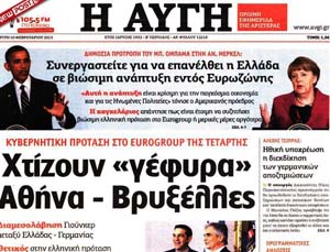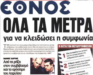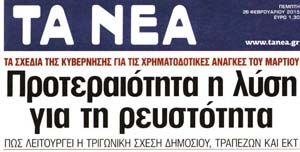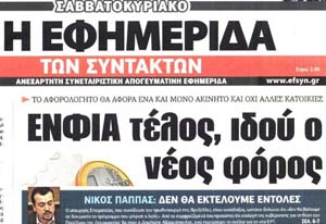 Το κύριο άρθρο κάθε εφημερίδας επιλέγεται από τον εκδότη της να αναφέρεται στο κυριότερο θέμα δημοσίου ενδιαφέροντος της ημέρας και ο τίτλος του αποδίδει περιεκτικά και κατά το δυνατό την πραγματική διάσταση αυτού του θέματος. Κατωτέρω επιλέγονται οι τίτλοι των κυρίων θεμάτων των κυριοτέρων εφημερίδων, που δείχνουν την εξέλιξη της οικονομικής κατάστασης της χώρας. Βέβαια, ανάμεσα σε αυτούς δίνονται στην κρίση σας και μερικοί "κακοήθεις", που έχουν στόχο τον αποπροσανατολισμό, ή "άσχετοι" για αναγνώστες στον δικό τους κόσμο!!!