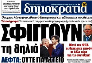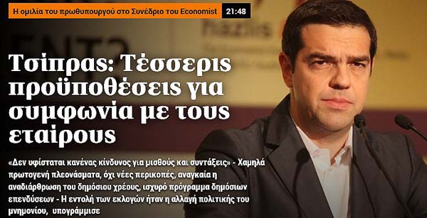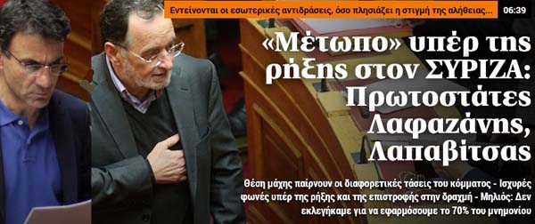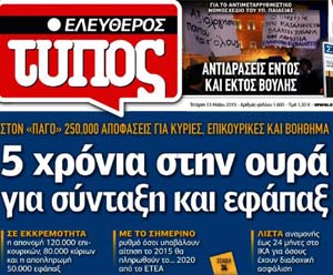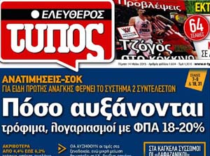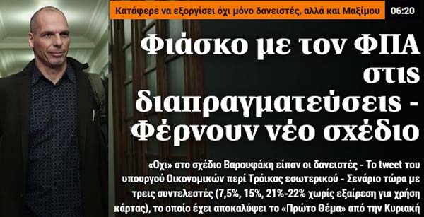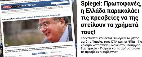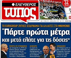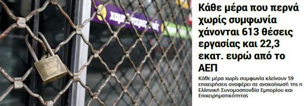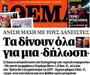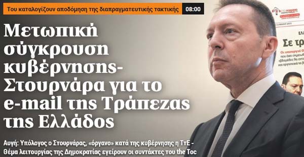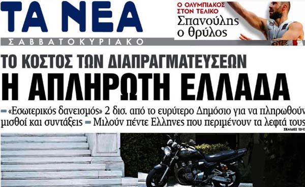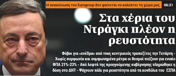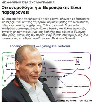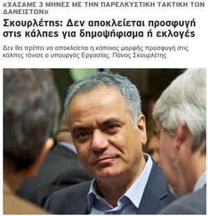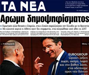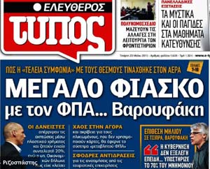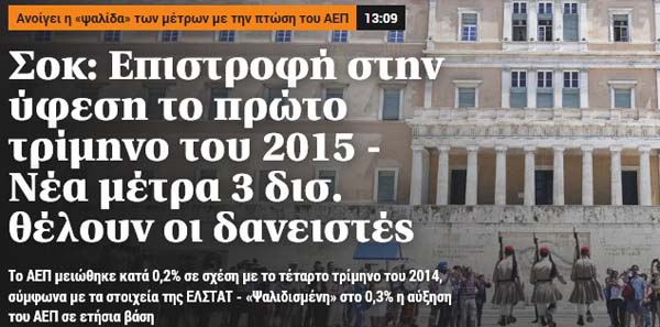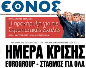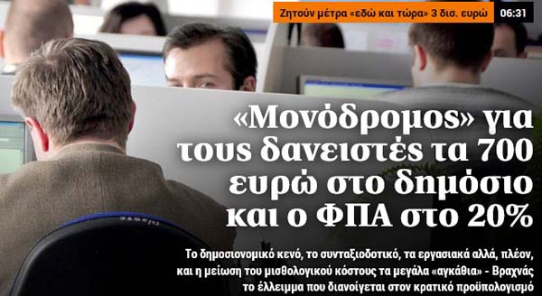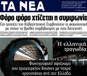 Το κύριο άρθρο κάθε εφημερίδας επιλέγεται από τον εκδότη της να αναφέρεται στο κυριότερο θέμα δημοσίου ενδιαφέροντος της ημέρας και ο τίτλος του αποδίδει περιεκτικά και κατά το δυνατό την πραγματική διάσταση αυτού του θέματος. Κατωτέρω επιλέγονται οι τίτλοι των κυρίων θεμάτων των κυριοτέρων εφημερίδων, που δείχνουν την εξέλιξη της οικονομικής κατάστασης της χώρας. Βέβαια, ανάμεσα σε αυτούς δίνονται στην κρίση σας και μερικοί "κακοήθεις", που έχουν στόχο τον αποπροσανατολισμό, ή "άσχετοι" για αναγνώστες στον δικό τους κόσμο!!!