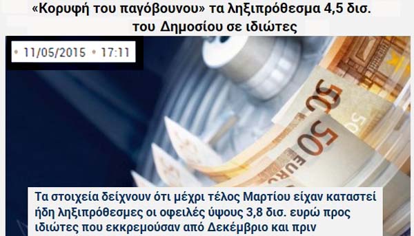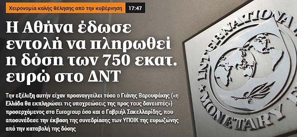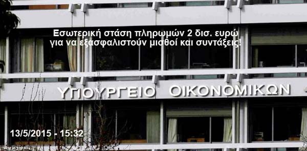 10/5/2015: Πληρώθηκαν στην ώρα τους: 6/5/2015: 200 εκ. τόκοι στο ΔΝΤ 12/5/2015: 760 εκ. δόση στο ΔΝΤ 13/5/2015: 500 εκ. σε μισθούς