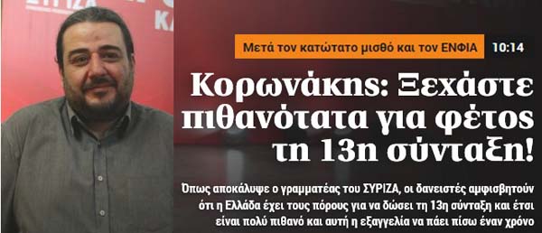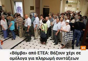 Το απόγευμα της 28ης Απριλίου έπρεπε να πληρωθούν μέσω τραπεζών οι συντάξεις του Μαΐου, οι οποίες μπαίνουν στους λογαριασμούς των δικαιούχων περί την 6η απογευματινή. Στα ΑΤΜ των τραπεζών δημιουργήθηκαν ουρές μέχρι τις 10 το βράδυ, διότι οι συντάξεις ΔΕΝ είχαν μπει ακόμα! Εγώ προσωπικά μπήκα στον λογαριασμό μου μέσω e-banking, αλλά με πέταξε έξω για ... τεχνικούς λόγους! Ποτέ Τράπεζα δεν χάνει τη λειτουργία των ηλεκτρονικών της συναλλαγών!Την επόμενη μέρα το πρωί ο Στρατούλης είπε σε κανάλι ψευδέστατα και χωρίς να ντρέπεται: "Είχε βλάβη το ΔΙΑΣ"!!! Το πιθανότερο είναι να είχε δοθεί εντολή από την Κυβέρνηση να κλείσουν οι τράπεζες το ηλεκτρονικό τους σύστημα για λίγες ώρες! Το γεγονός της ΜΗ ΥΠΑΡΞΗΣ χρημάτων την ημέρα της πληρωμής τους αποδεικνύει ότι τον επόμενο μήνα να πληρωθούμε με "Νέο Χρήμα" τα χιλιάρικα, που βλέπετε, στα οποία όλα τα καταλαβαίνετε εκτός από το "ΣΧ", που σημαίνει "Στα Χρωστάω"!!! Μακάρι να κάνω λάθος!!! |