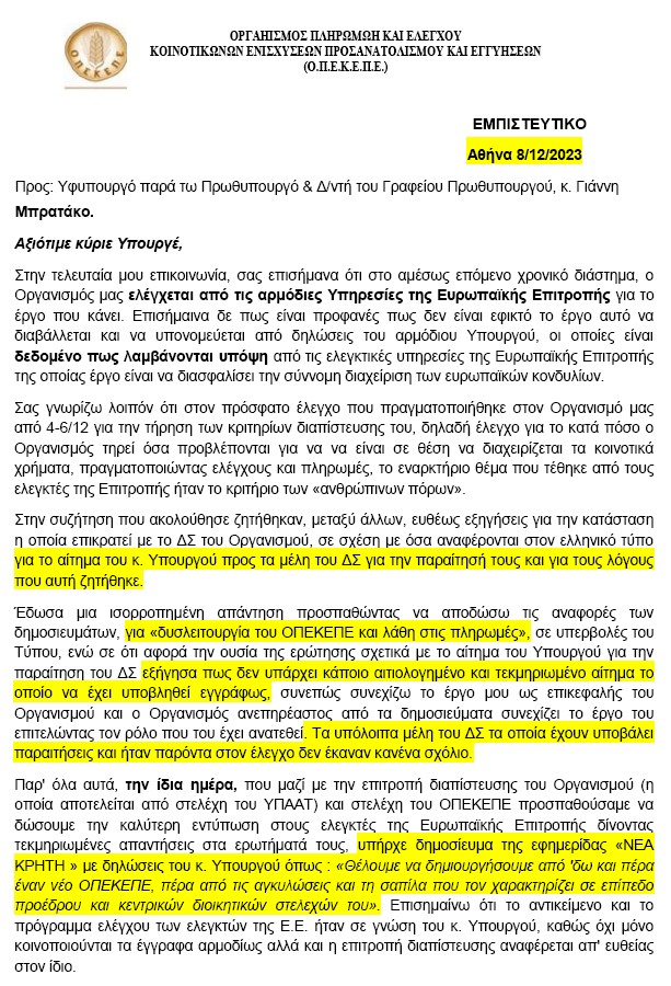 Κατωτέρω δίνουμε την από 8/12/2023 επιστολή Σημανδράκου προς τον Υφυπουργό παρά τω Πρωθυπουργό & Δ/ντή του Γραφείου Πρωθυπουργού, κ. Γιάννη Μπρατάκο.