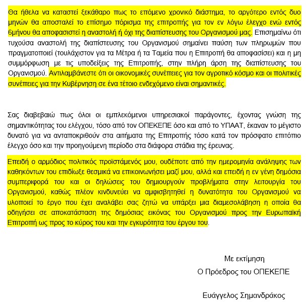 «Το πρώτο... ότι οι υπεύθυνοι του οργανισμού και όχι μόνο παρά τις καταγγελίες έκαναν τα στραβά μάτια. Δείτε τι αναφέρουν χαρακτηριστικά. Το πρόβλημα, έχει καταγγελθεί πολλές φορές, αλλά οι υπεύθυνοι του ΟΠΕΚΕΠΕ καθώς και του Υπουργείου Γεωργίας κάνουν στραβά μάτια αφού φαίνεται να υπάρχει ομερτά εν είδη συμμορίας μέσα και έξω από τον ΟΠΕΚΕΠΕ και ρυθμίζει τα θέματα στο παρασκήνιο και με το μαύρο χρήμα κλείνει στόματα. |